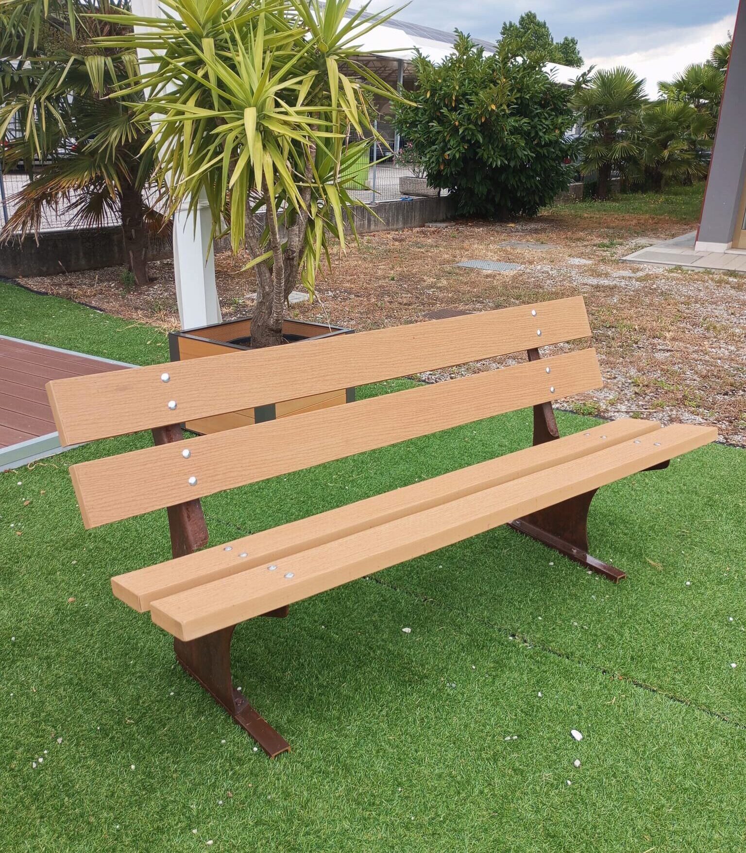 Panchina da esterno con tavole in WPC, 16 bulloni in acciaio INOX e gambe in acciaio corten. Materiali 100% Made in Italy. Adatta ad ambienti esterni come parchi, giardini, aree urbane, spazi pubblici e privati. Solida e duratura: non richiede applicazione di trattamenti o vernici, è resistente a muffe e umidità.